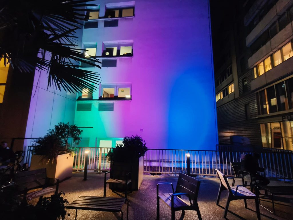 Illumination des façades de l’hôpital Necker et du bâtiment Copernic de l’hôpital Cochin aux couleurs des maladies rares.