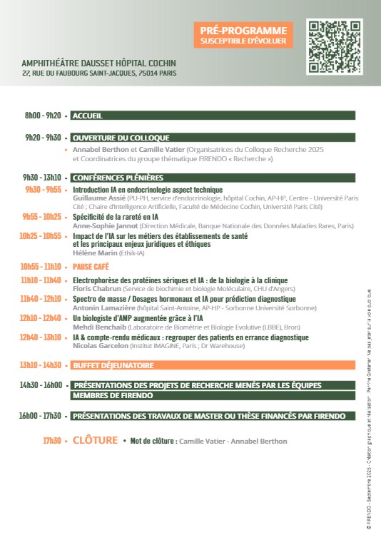 Le programme a été élaboré par le groupe thématique Recherche biomédicale de FIRENDO, avec des intervenants de renom qui vous feront découvrir au cours des conférences plénières de la matinée, les multiples domaines d’application de l’intelligence artificielle dans le champ des maladies rares endocriniennes.
